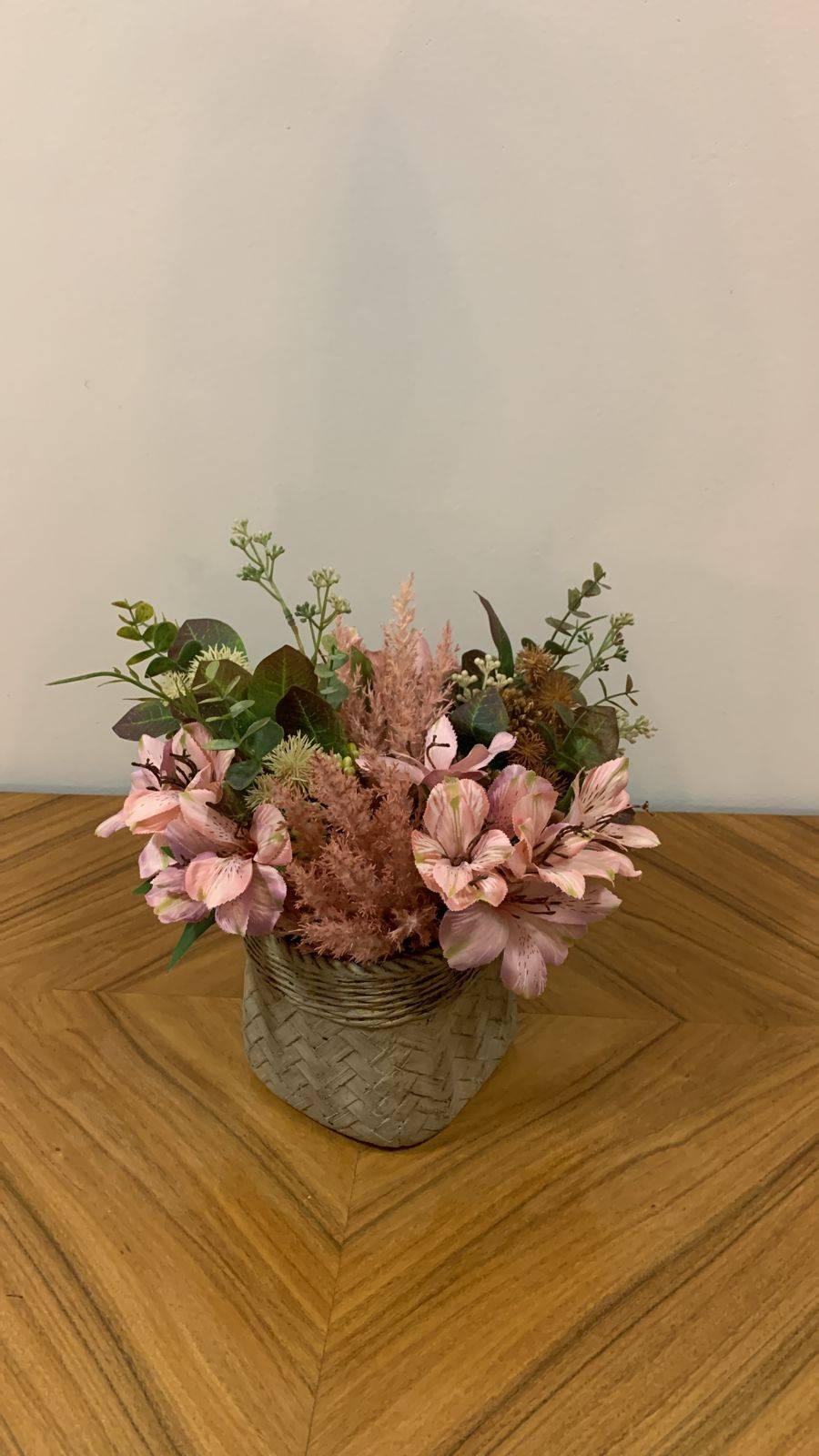 ARRANJO FLORES ROSA E PLUMAGEM