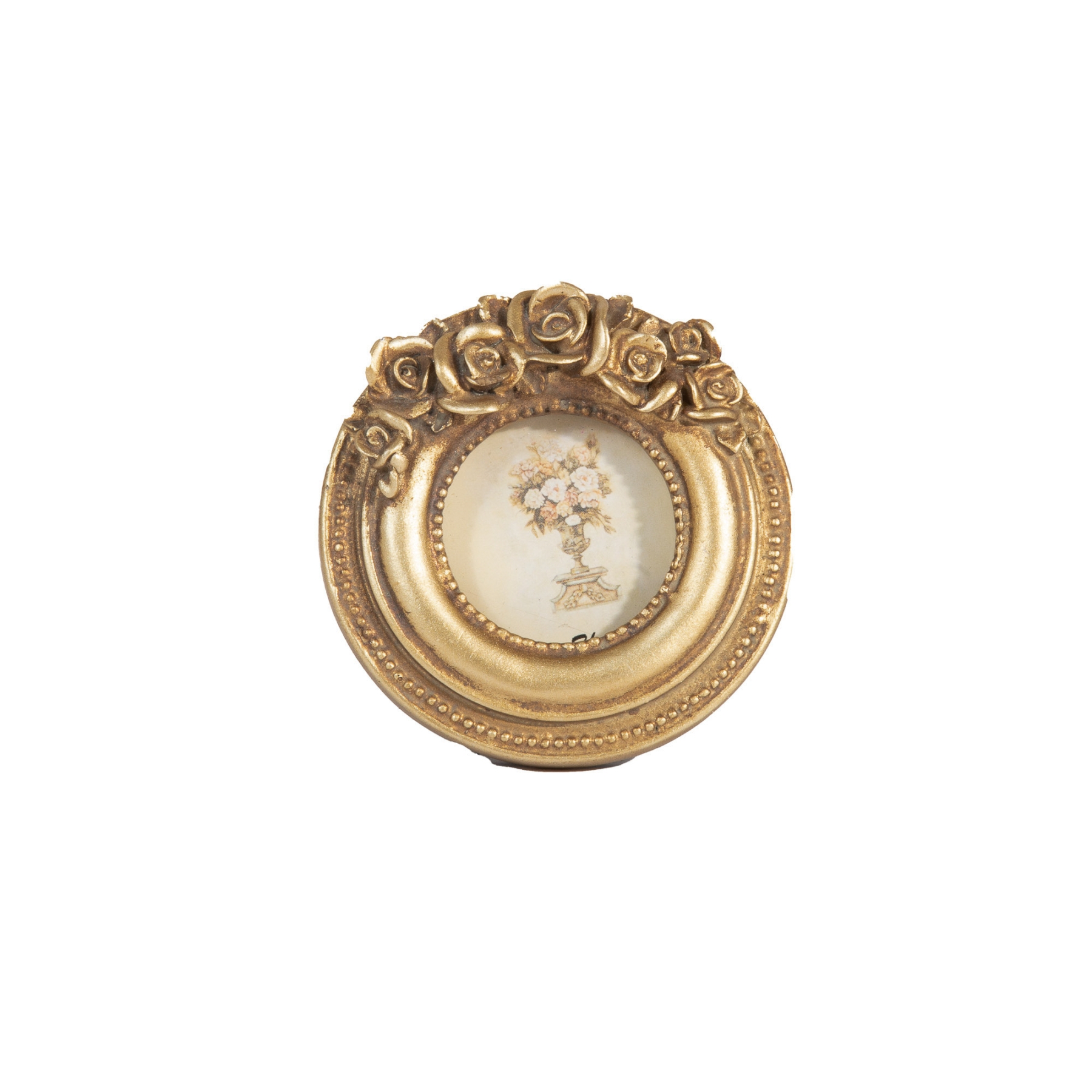 MINI PORTA RETRATO REDONDO DOURADO C/ FLOR